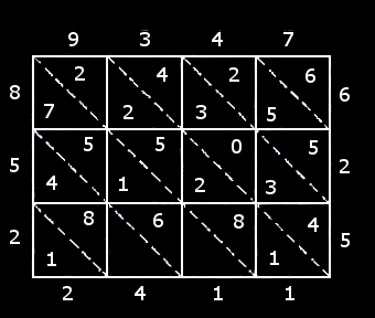 4. В старинных итальянских рукописях встречается любопытный способ умножения многозначных чисел, который известен под названием мусульманского (или индусского) метода . Предположим, что нам надо перемножить числа 9347 и 258. Для этого начертите на клетчатой бумаге три ряда по четыре клетки в каждом. Наверху напишите слева направо цифры множимого 9, 3, 4 и 7, а слева снизу вверх цифры множителя 2, 5 и 8. Проведя диагонали, как показано на рисунке, можете начинать умножение с любой цифры множимого на любую цифру множителя.9 * 9 + 7 =98 * 9 + 6 =987 * 9 + 5 =9876 * 9 + 4 =и т.д.